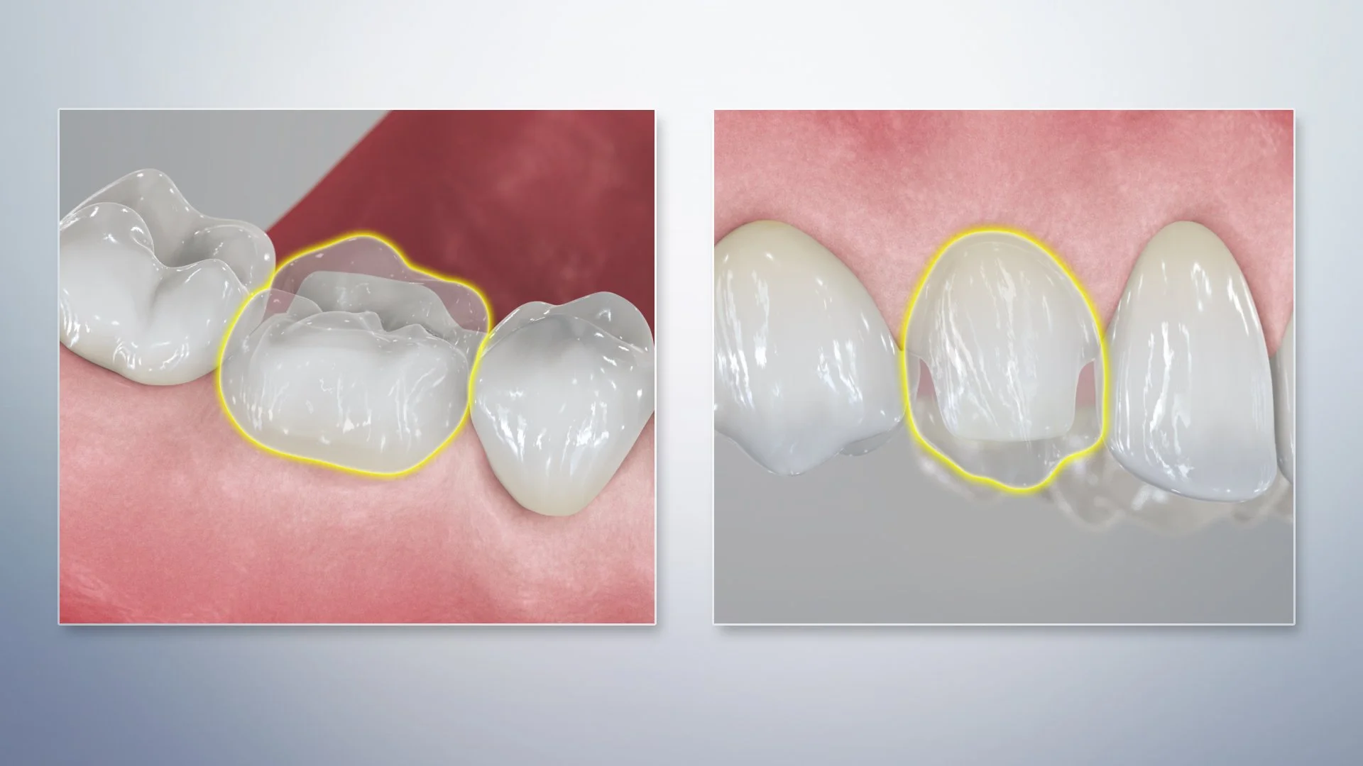 Crowns and restorations rebuild structure and function.